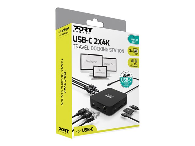 La station d'accueil de voyage PORT Connect USB-C 2X4K augmente la connectivité des ordinateurs portables et fournit jusqu'à 85W de puissance via un réplicateur de d'énergie. Ce dispositif prend en charge jusqu'à 10 périphériques simultanément. Il peut afficher deux écrans supplémentaires à haute résolution via Display Port, jusqu'à 4K Ultra HD. Ses 5 ports USB-A offrent un transfert de données à haut débit (jusqu'à 5Gb/s.) et son port USB-C permet de charger des périphériques et de transférer des données jusqu'à 10Gb/s. La station d'accueil est compatible avec les PC et les Chromebook. Sa taille est adaptée à la mobilité.
