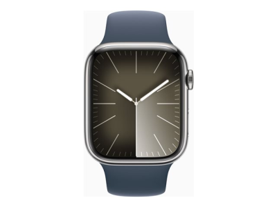 Apple Watch Series 9 (GPS + Cellular) - 45 mm - acier inoxydable argent - montre intelligente avec bande sport - fluoroélastomère - bleu orage - taille du bracelet : M/L - 64 Go - Wi-Fi, LTE, UWB, Bluetooth - 4G - 51.5 g MRMP3QF/A