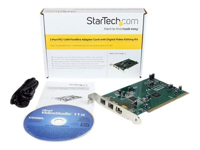 Cette carte FireWire 3 ports PCI1394B_3 transforme un slot PCI en 2 ports FireWire 800 (IEEE 1394b) et 1 port FireWire 400 (IEEE 1394a), offrant ainsi une solution économique vous permettant de connecter des périphériques FireWire 800 et des FireWire 400 plus anciens sur votre ordinateur de bureau. La carte adaptateur offre une solution polyvalente, elle est compatible avec les slots PCI 5 V et 3,3 V et les environnements d'exploitation 64-bit et 32-bit. Elle permet ainsi de créer un centre multimédia numérique haute vitesse pour ordinateur portable ou de connecter des périphériques FireWire exigeants, tels que les disques durs portables, les caméscopes vidéo numériques, les appareils photo numériques et les lecteurs CD-RW/DVD-RW. Cette carte adaptateur de haute qualité est conçue pour fournir des connexions FireWire 800 et FireWire 400 fiables, qui offrent respectivement des vitesses de transfert de données de 800 Mb/s et 400 Mb/s (un slot PCI 64 bits est requis pour obtenir une vitesse de transfert de données de 800 Mb/s). Le modèle PCI1394B_3 bénéficie de la garantie à vie StarTech.com et de l'assistance technique à vie gratuite.